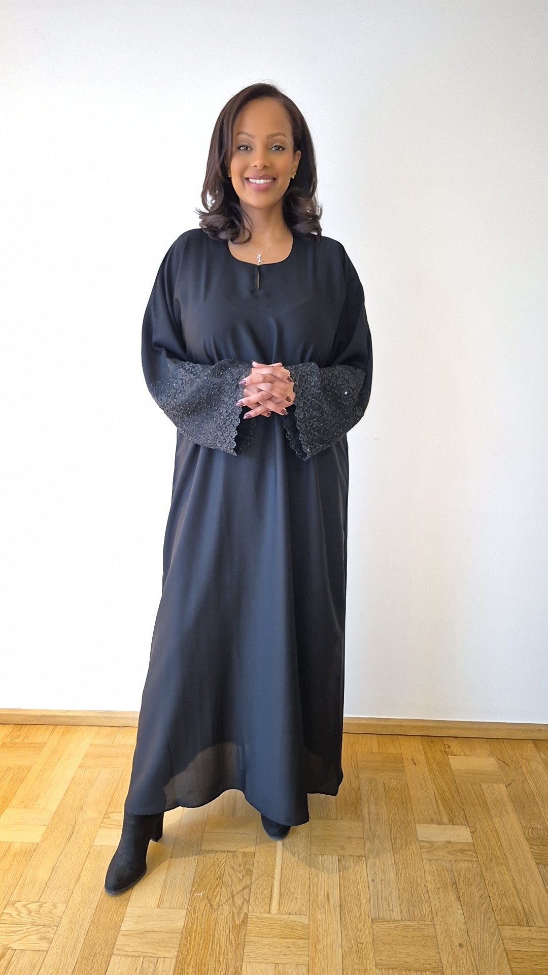 Crafted in Signature Soft Crepe with statement lace sleeves, paired with a matching chiffon hijab featuring delicate detailing.
