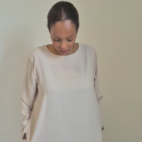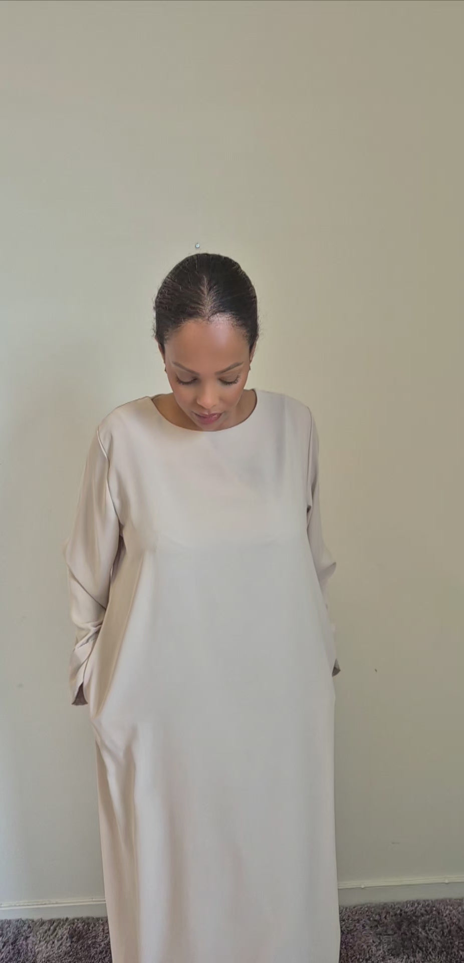Model is 171 cm and wearing size L/XL wearing a simple and elegant abaya with pockets