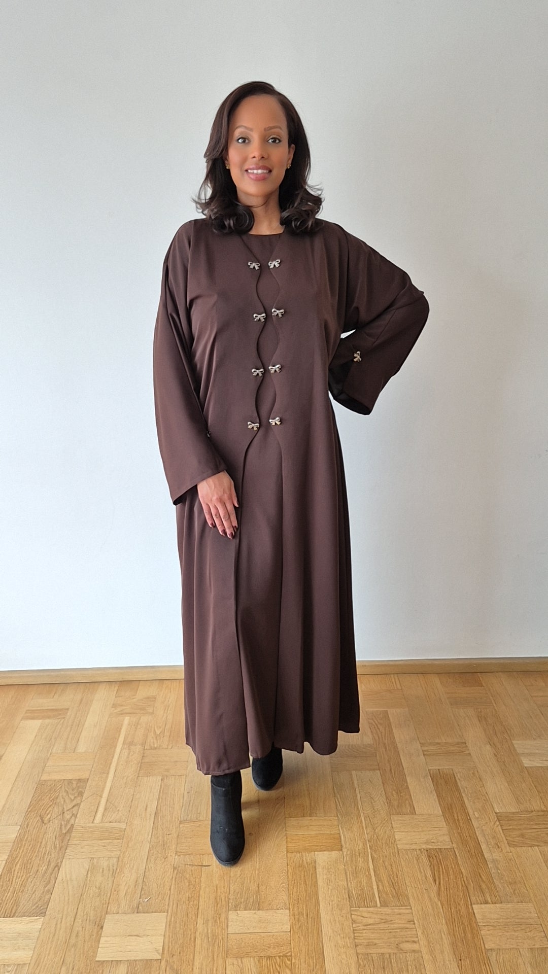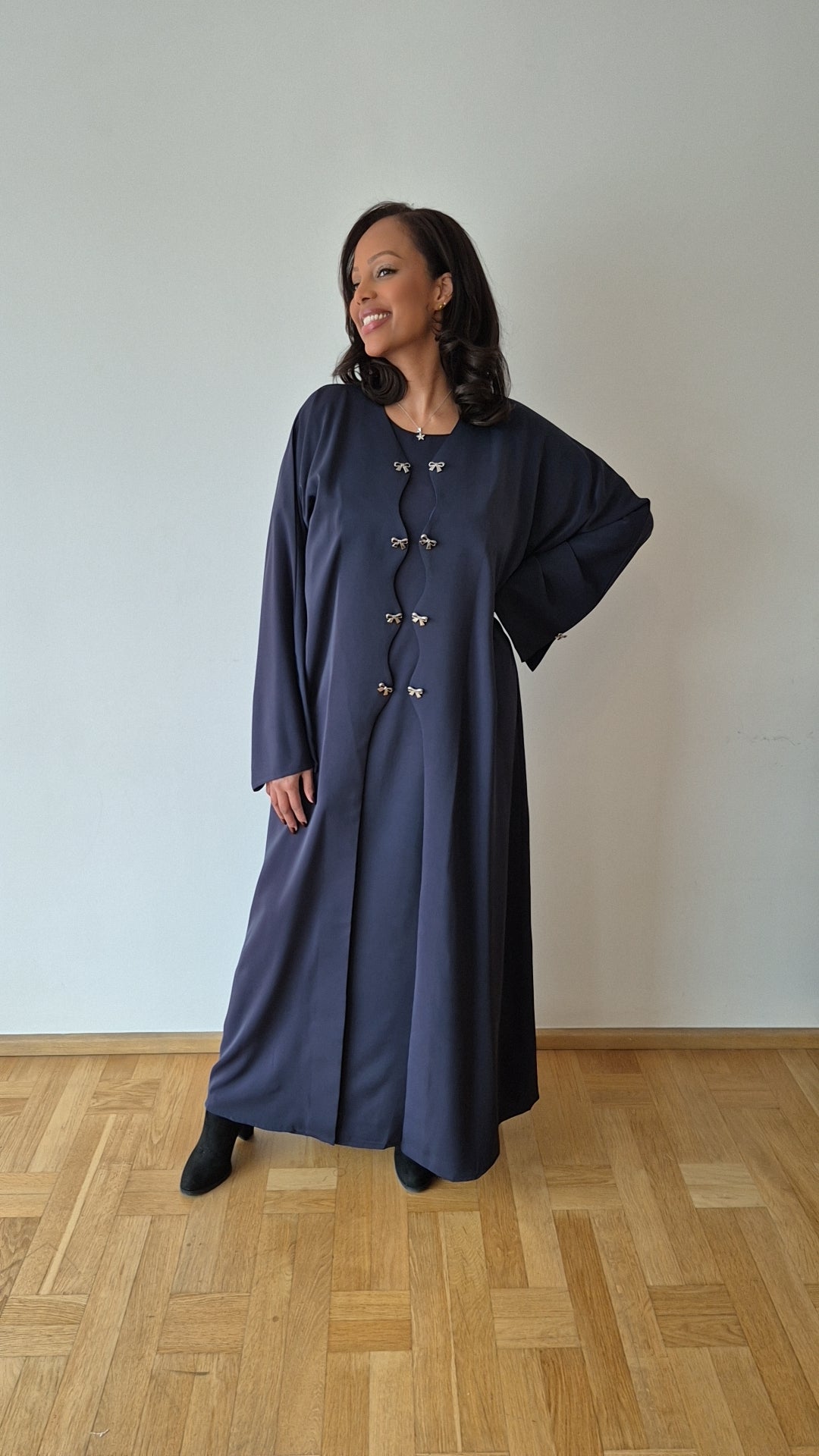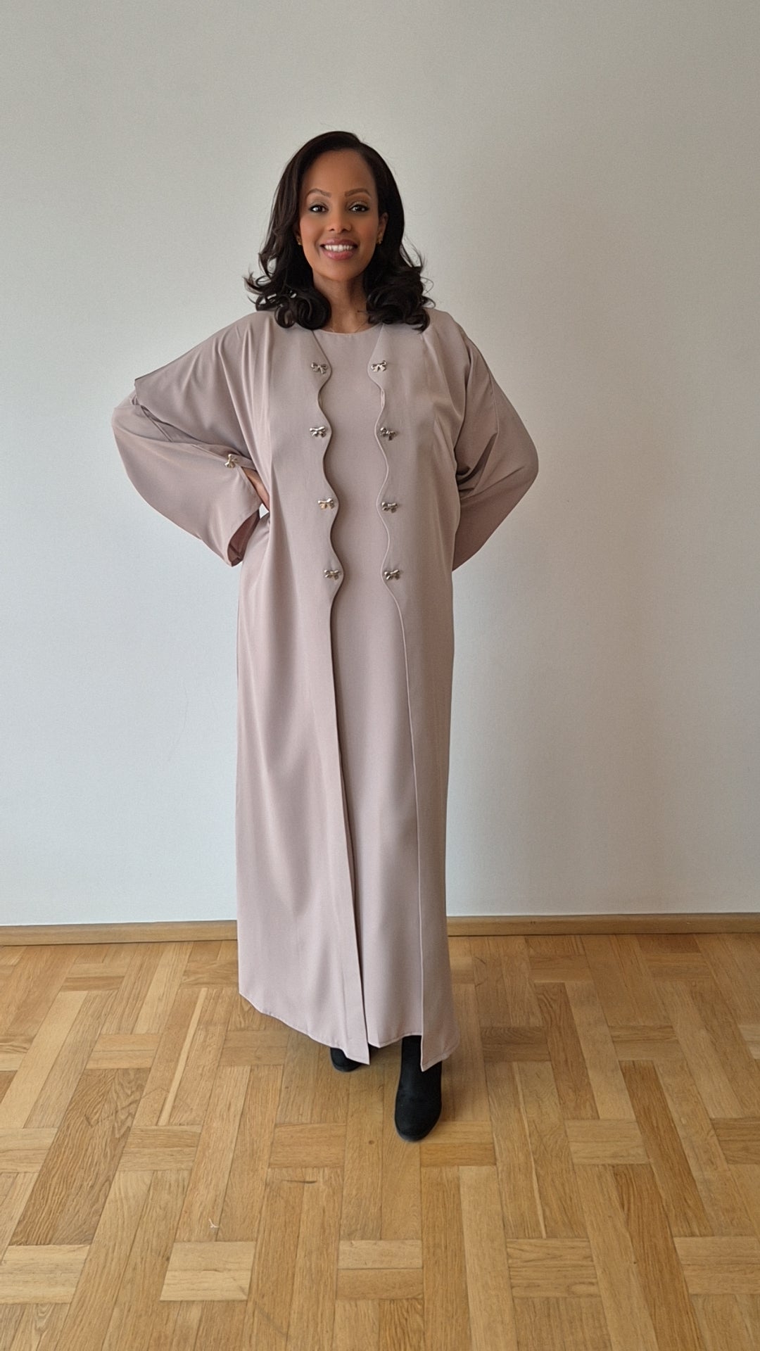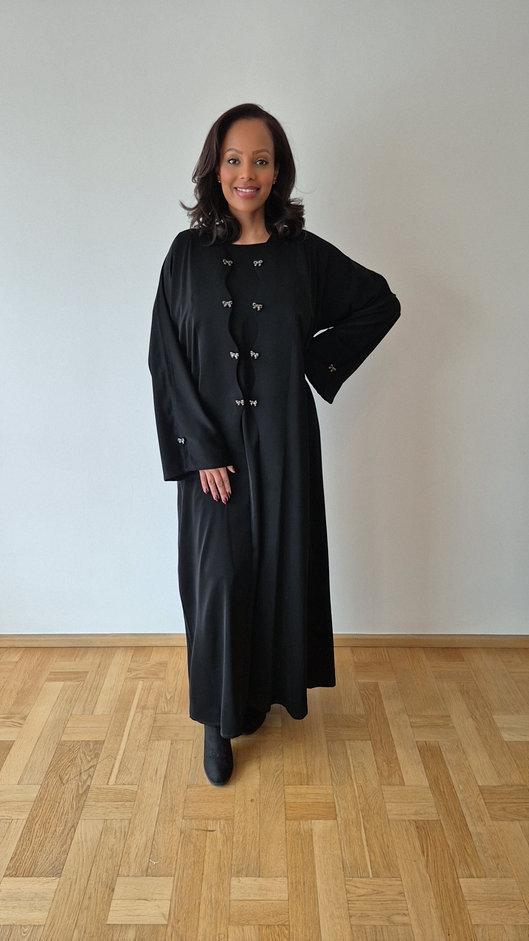 Crafted in premium Nida for a smooth, fluid drape with elegant front detailing. Includes a matching chiffon hijab.