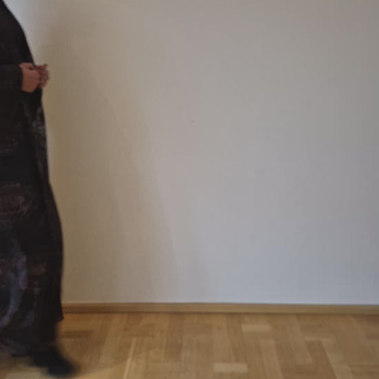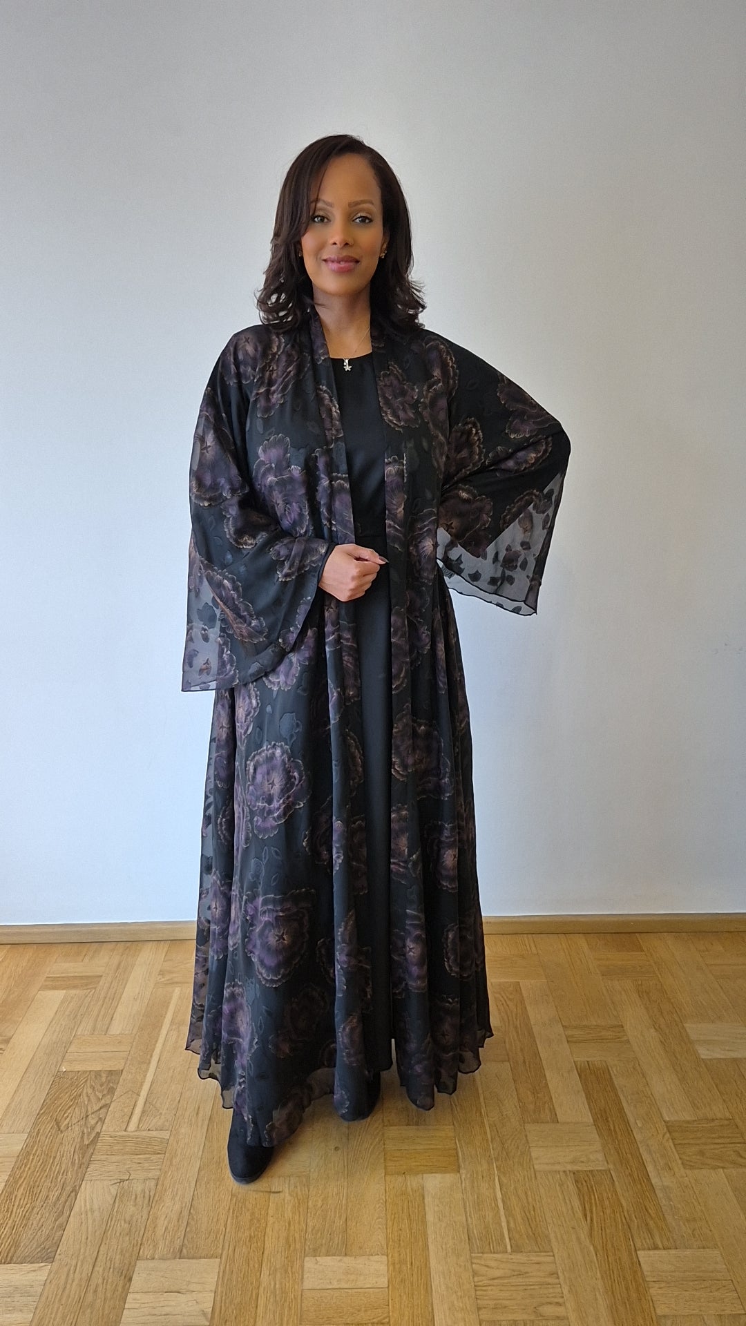 Wardah Plum features a lightweight floral chiffon outer layer layered over a sleek black inner dress, creating graceful, gown-like movement with every step. The rich plum tones bring depth and sophistication while maintaining a timeless silhouette.